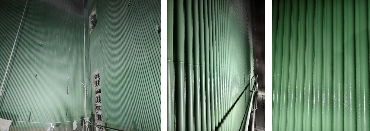 随后,团队在165MW机组开展了纳米高熵陶瓷涂层的全炉膛辐射受热面应用。西安热工研究院能效测试结果表明,材料在炉膛服役5个月后,炉内无明显结焦和高温腐蚀现象。通过对比喷涂前、后实测数据,在高、中、低负荷下,炉内有效吸热量平均提升5.19%,减温水量整体降低2.6t/h,排烟温度降低4.5℃,灰渣物理热损失降低0.21%,锅炉热效率提升0.46%,供电煤耗降低1.5g/kWh。对于1000MW煤电机组每年节煤13140吨。此外,喷涂纳米高熵陶瓷涂层还有效缓解了高温氧化与磨损风险,增强了机组的煤种适应性。