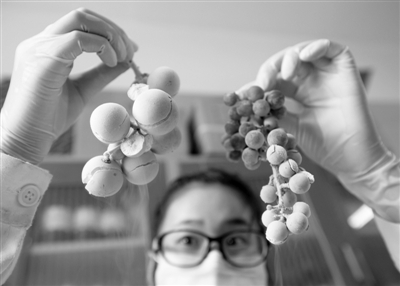 7月17日,中科院植物研究所科研人员在实验室里展示经液氮降温处理后的新品种葡萄的样品。