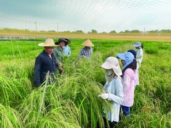 何祖华(左一)带领学生在田间调查水稻抗病性。课题组供图