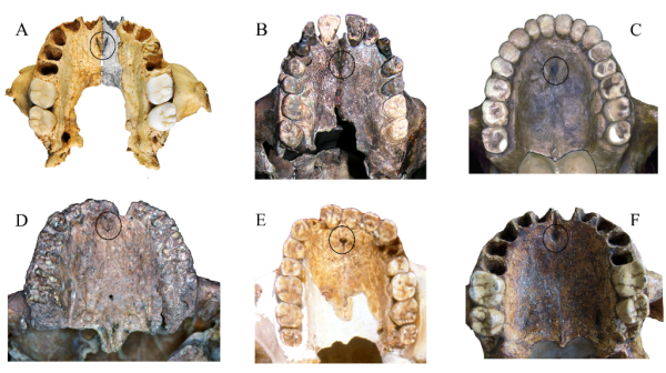 华龙洞6号与部分古人类化石硬腭部门齿孔位置。(A)华龙洞6号; (B)非洲直立人; (C)周口店直立人; (D)摩洛哥中更新世晚期早期现代人; (E)金牛山人; (F)山顶洞人(中科院古脊椎所供图)