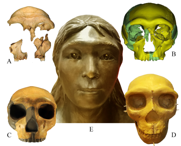 华龙洞6号头骨面貌复原:(A)华龙洞6号化石;(B)虚拟复原头骨;(C)实体复原头骨;(D)雕塑头骨;(E)复原像(中科院古脊椎所供图)