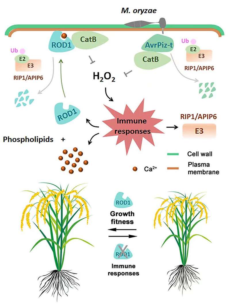 水稻是我国最重要的粮食作物之一,但近年来,我国水稻病虫害发生情况严重,病虫害种类多,发生范围广,呈现多发、频发、老病新发态势,对我国农业生产和粮食安全构成严重威胁。因此,为了有效控制水稻病害,保障我国粮食高产稳产,作物育种学家和病理学家长期致力于选育广谱持久的水稻抗病品种,但高抗的水稻品种往往生长发育受到限制,导致产量降低,即以牺牲生长发育为代价换取抗病性以实现最终的生存。那如何在水稻抗病的同时不影响其产量性状,维持好植物抗病与生长发育的平衡?此外,面对病原菌的不断进化,如何让植物的免疫屏障有效抵御不同病原菌的反复进攻?