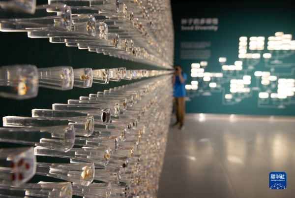 10月10日,在举行发布会的中科院生物多样性成果展现场,“种子圣殿”展墙展示种子多样性。
