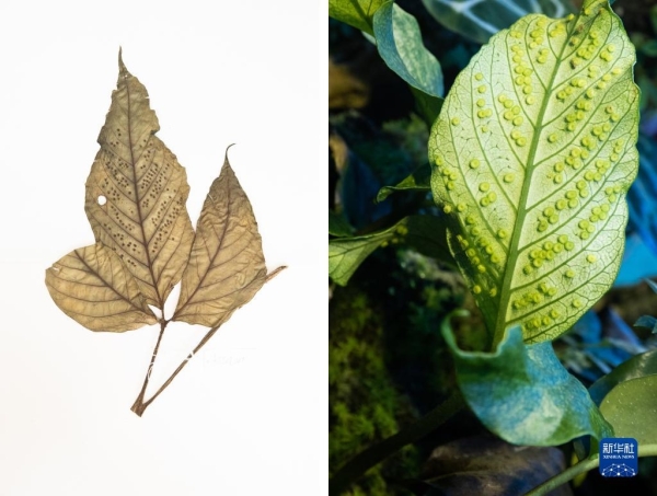 这是10月10日在昆明植物园拍摄的西畴青冈。这张拼版照片分别为科研人员野外采集的标本(左)和在植物园迁地保护后存活下来的同种植物。新华社记者 金立旺摄