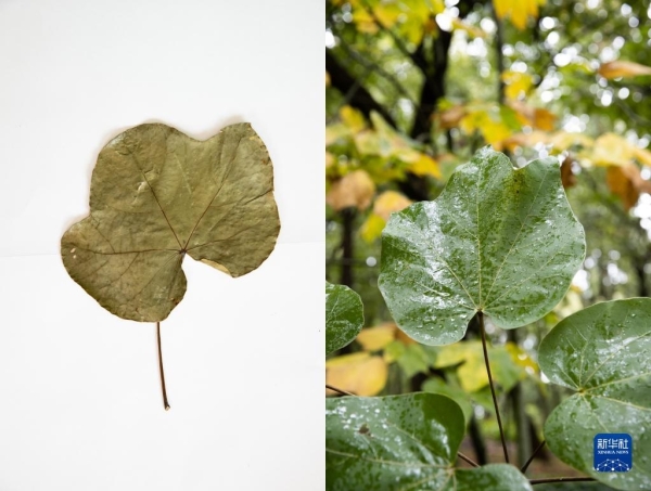 这是10月10日在昆明植物园拍摄的云南梧桐。这张拼版照片分别为科研人员野外采集的标本(左)和在植物园迁地保护后存活下来的同种植物。新华社记者 金立旺摄