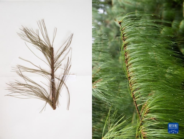 这是10月10日在昆明植物园拍摄的巧家五针松。这张拼版照片分别为科研人员野外采集的标本(左)和在植物园迁地保护后存活下来的同种植物。新华社记者 金立旺摄