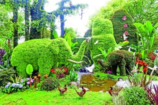 为迎接COP15的召开,100组展现生物多样性保护元素的植物雕塑亮相昆明街头。图为翠湖公园门口的“彩云之南”。本报记者 周梦爽摄/光明图片