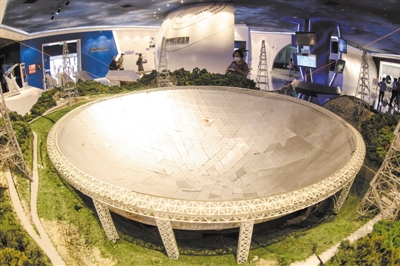 7月20日,参观者在天文小镇上的“天文体验馆”内观看“中国天眼”模型。新华社记者 欧东衢摄