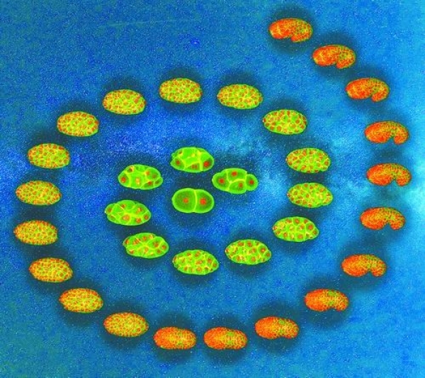 线虫胚胎发育之路,从中心到外缘胚胎细胞不断分裂,走向成熟。杜茁团队供图