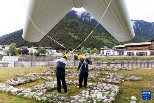 9月18日,“极目一号”浮空艇大气观测试验现场,科研人员在操作辅助系索。新华社记者 金立旺 摄