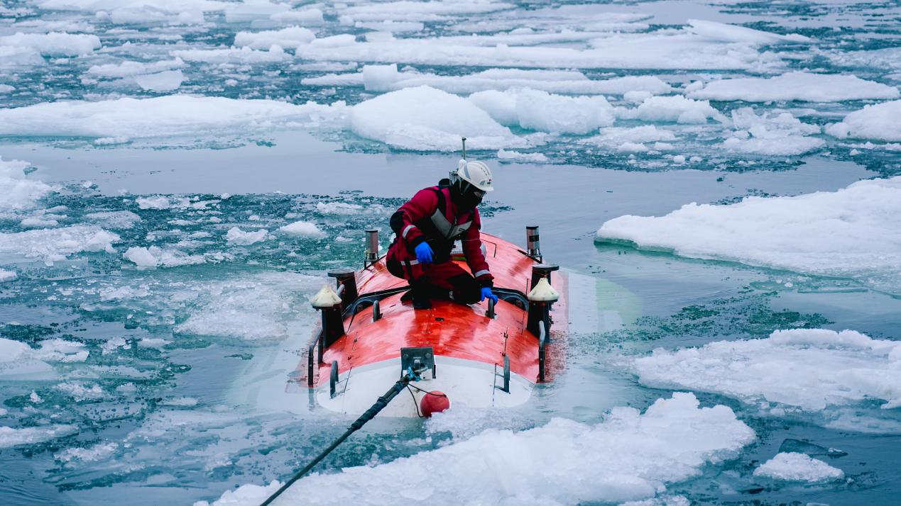“奋斗者”号在北极密集冰区被起吊出水。图片来源:“探索三号”船
