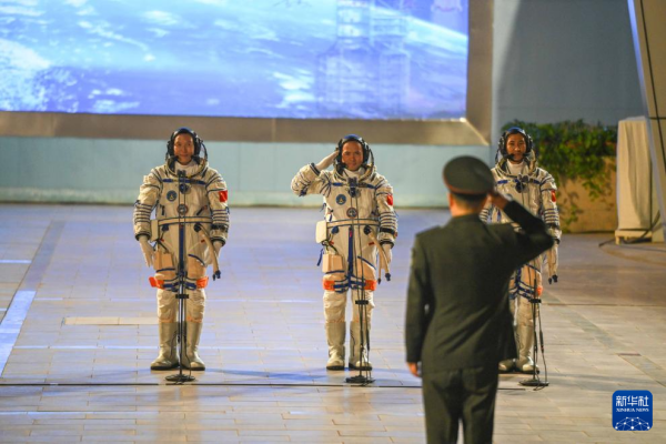 神舟二十一号载人飞行任务航天员乘组出征仪式在酒泉卫星发射中心问天阁圆梦园广场举行。 新华社记者 李明刚 摄