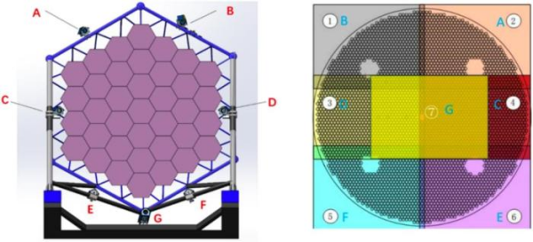 LAMOST光纤检测相机在主镜MB周围的安装位置(左)及对应相机在焦面上覆盖的区域分布(右)。无码影片 国家天文台 供图