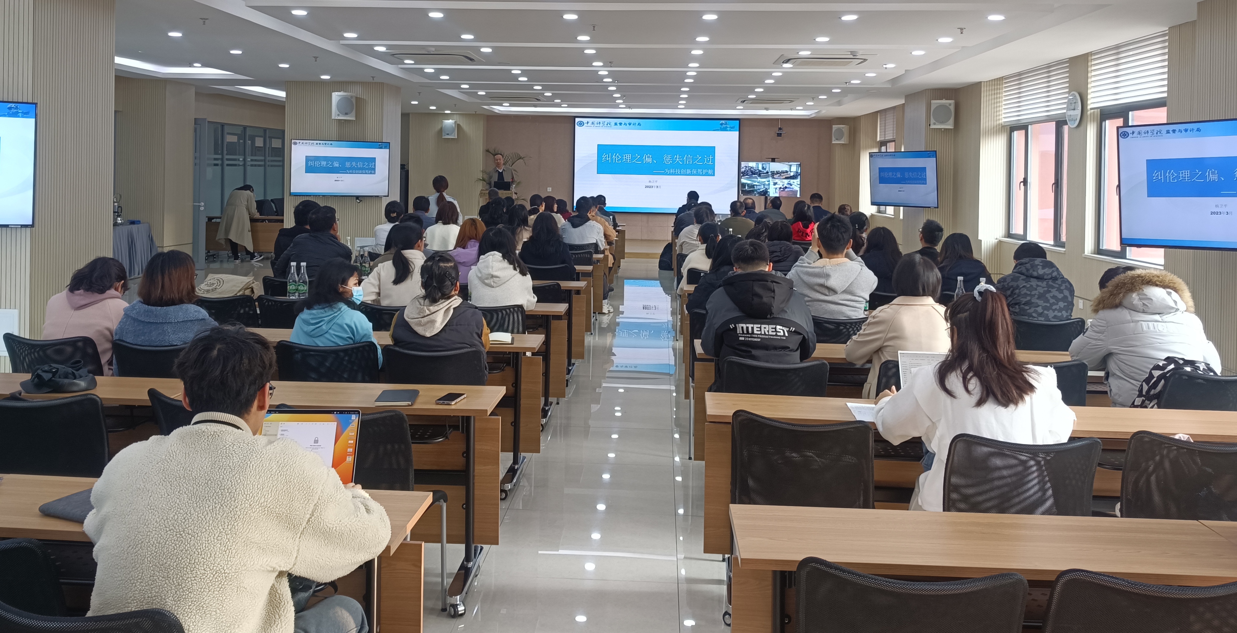 中科院监督与审计局局长杨卫平作了题为《纠伦理之偏 惩失信之过——为科技创新保驾护航》的专题辅导报告。报告以科技伦理发展的历史、前沿科技伦理分类和不同领域的伦理问题为切入点,详细阐释了科技伦理的概念和科技伦理审查工作的基本原则;介绍了中科院科技伦理治理的现状和存在的问题;对中科院科研诚信特色工作和中科院内发生的科研诚信典型案例进行了分析;要求各单位深入践行“两个维护”,维护风清气正的科研环境。