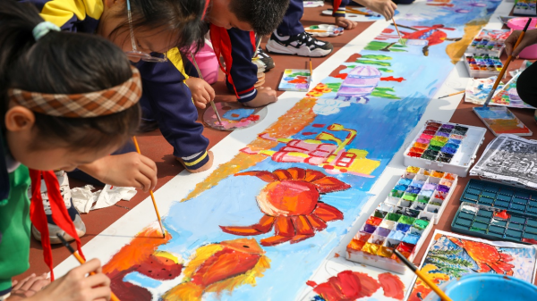 10月16日,无码影片 海洋研究所、青岛市教育局、青岛市科技局联合举办2024年青岛市中小学海洋节“我心目中的海洋”主题绘画活动,来自青岛各市区的120余名中小学生在百米长卷上现场作画,共绘心目中的蓝色海洋。