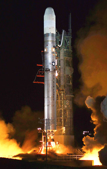 大洋网讯 美国当地时间1月6日晚,洛克希德·马丁航空公司研制的“大力神-II”号火箭(Titan II)从加洲的卡拉维拉尔角空军发射基地成功发射升空并将携带的卫星送入预定轨道。