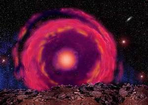 据报道,俄罗斯太阳地球物理学院西伯利亚分院的图像资料演示:超新星爆炸后约8分钟,整个星空淹没在巨大而可怕的耀斑之中。接下来,与爆炸发出的使人目眩的光芒一起到来的看不见的X射线、紫外线和辐射,它们冲破大气保护层,瞬间就会毁灭所有生物。爆炸的辐射能量使大气层和行星表面的温度一下子加热到几千华氏度。海水开始大量蒸发。行星被灼热的气体笼罩。透过浓雾,一只膨胀的球体在闪闪发光,夜色苍穹红里透紫,整个场面十分可怕。 |