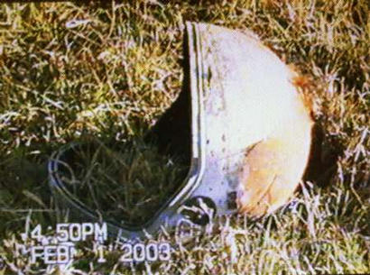 图为在哥伦比亚号航天飞机失事地点附近一户人家院内拍到的遇难宇航员的头盔。