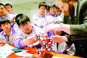 从昨天开始,北京四所中学150名学生将搭建一座高2.5米的DNA模型,并于24日起在清华大学展出。图为北京翠微中学的高一学生在英国琼斯博士的指导下搭建模型。
