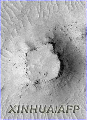 这是美国宇航局6月16日公布的“火星环球勘测者”号探测器拍摄的火星地貌照片。照片上显示一处小型环形台地,周围是尘土覆盖的小丘及波纹状平原,台地的斜坡上布有块状浮石。新华社/法新