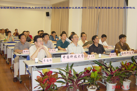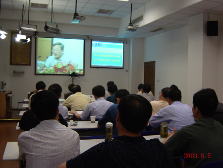 党组扩大会议精神传达会”会议实况。大家听得非常认真,许多人一丝不苟地做着笔记,整个会场非常安静,大家的思绪随着路院长的讲话在跳动和延伸。屏幕上的图像清晰,声音宏亮,给人以身临其境的感觉,北京现场的热烈气氛也感染了合肥分会场的每一个与会者。会后,大家表示,要进一步深入学习夏季党组扩大会议精神,深刻领会路甬祥院长的讲话内涵,尽快将会议精神传达给广大科技和管理人员,在狠抓落实上下功夫。同时,大家认为,院视频会议系统的开通和投入使用标志着中科院信息化工作上了一个新的台阶;它将大大促进科学院内部的信息传递及沟通和交流,减轻领导和管理人员的会议负担,使大家能有更多的时间和精力投入科技创新工作。