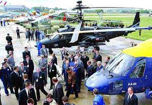 第六届俄罗斯国际航空航天展十九日在莫斯科东郊的茹科夫斯基市拉开帷幕。图为普京总统(中)正在参观俄武装直升机