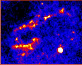 另一项发现是在Ks-band影像里,云团中心附近发现数条喷流与结状结构(图3),很可能是当中年轻恒星所喷出的物质与周围云气碰撞压缩所形成的高温分子氢,也就是天文学家所称的赫比格-哈罗星体(Herbig-Haro objects)。