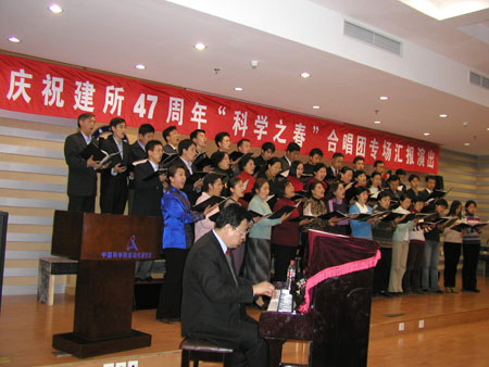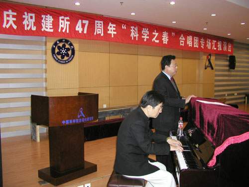 自动化所庆祝建所47周年“科学之春”合唱团汇报演出于10月21日晚在自动化大厦报告厅举行。自动化所所长谭铁牛,党委书记、副所长张平,副所长乔均录,副所长谭民,所长助理赵红岩出席并观看了演出。演出还特别邀请了来自二炮文工团著名歌唱家、指挥家、国家一级演员熊亚光,武警文工团著名歌唱家、指挥家、国家一级演员朱成志作为嘉宾出席。当晚两位嘉宾分别为演出担任了指挥和伴奏。