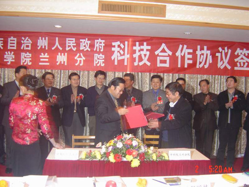 1月11日下午,在甘肃省十届人大二次会议和政协九届二次会议期间,兰州分院与甘南藏族自治州人民政府在兰州饭店签订了科技合作协议书。协议约定,双方以“优势互补、互惠互利、真诚合作、共同发展”为原则,重点围绕甘南州“双遗产”申报、黄河上游生态环境保护及综合治理、改造提升中藏药产业、农畜产品深加工、决策咨询研究和信息咨询服务等方面开展深入的合作,推动把甘南州建成一个经济效益、社会效益和生态效益并举的“特殊生态功能保护区”和“民族文化大州”。这是兰州分院贯彻“三个代表”重要思想和省委“一带两翼”战略的具体体现,也是落实新一轮省院科技合作协议的具体行动。