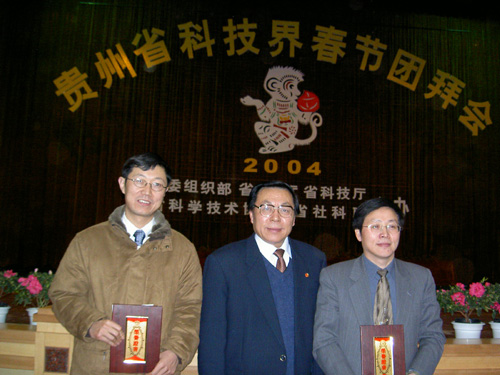 贵州省表彰优秀科技工作者 1月18日,在贵州省科协、省科技厅、人事厅、社科联联合主持的贵州省科技届2004年春节团拜会上,中共贵州省委副书记孙淦代表省委、省政府向扎根贵州、为贵州经济建设作出贡献的广大科技工作者恭贺新春,与此同时,贵州省副省长刘鸿庥及有关领导宣布了省政府政府关于对荣获贵州省2001—2002年度优秀科技工作者进行表彰的决定,对中科院地化所刘丛强研究员、贵州大学丁贵杰教授等10位优秀科技工作者给以表彰并记一等功一次。