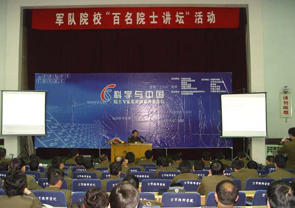 “科学与中国”院士专家巡讲团结合解放军总参组织的“百名院士讲坛”活动,将在军队院校组织一系列的巡讲报告会。通过巡讲团报告活动,追踪科学发展和科技应用,科学态度与科学精神,激发学员的学习热情和成才动力,树立热爱祖国、热爱军队和献身国防的崇高理想,提高人才培养质量、综合素质和军事素养。 |