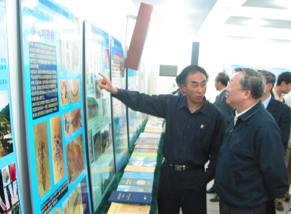 路甬祥院长首先参观了南京古生物所的创新成果展示厅。南京古生物所所长沙金庚结合展示内容向路甬祥院长详细汇报了创新以来研究所所取得的一些重要科研成果及获奖情况。1998以来,南京古生物所在Science上和Nature上发表13篇,一些重大成果在1998、1999、2000、2002年入选我国十大科技进展(科技新闻),先后有18项成果获国家级及部省级奖励,其中2003年“澄江动物群与寒武纪大爆发”获国家自然科学奖一等奖,2002年“全球二叠系——三叠系界线层型研究”获国家自然科学奖二等奖。路院长在观看展示的同时,不断询问有关早期生命演化与寒武纪大爆发、热河生物群、全球界线层型、生物灭绝与复苏以及分子古生物学等研究方面的近期研究进展情况。路院长对南京古生物所取得的成绩给予了充分的肯定,并希望继续努力,瞄准国际前沿,不断发现学科上新的增长点。