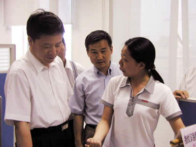 广州市林元和副市长一行访问自动化所,林副市长测试指纹采集设备。