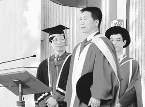 12月9日,为表彰中国首位登上太空的航天员杨利伟对中国航天事业作出的贡献,香港中文大学颁授杨利伟荣誉理学博士学位。图为杨利伟(前)在学位颁授仪式上。(新华社记者 张雅诗/摄)
