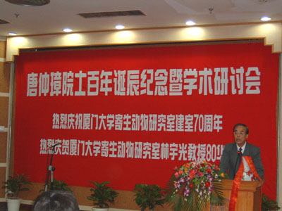 同日下午,唐仲璋院士百年诞辰学术研讨会在厦门大学克立楼举行。福建省微生物研究所所长程元荣教授、上海第二军医大学基础医学部病原生物学教研室主任潘卫庆教授、上海交通大学医学院分子生物学研究室主任乔中东教授、中国农业科学院上海家畜寄生虫病研究所所长林矫矫教授分别就《微生物新药的研究方向和途经》、《疟疾疫苗的现状和展望》、《雄激素增加布氏利什曼原虫感染及诱导巨噬细胞凋亡的分子机制》、《日本血吸虫性别和期别差异表达基因和蛋白的研究》为题作了学术报告。 |