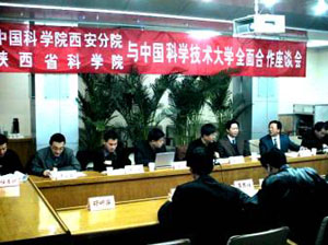 西安分院、陕西省科学院与中国科学技术大学在西安召开了全面合作座谈会,会后,双方签定了全面合作协议。参加座谈会暨协议签定仪式的有以中国科学技术大学党委常务副书记、副校长许武带队的科大各学院院长等10人。西安分院、陕西省科学院党组书记、常务副院长周杰,副院长沈茂才和分省院研究所所长书记以及分省院各处室负责人等共计30多人。