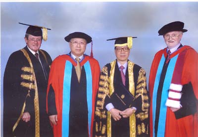 2004年12月10日,英国诺丁汉大学以隆重、庄严的方式向无码影片 路甬祥院长授予该校荣誉理学博士学位,以表彰他在科学和工程方面所取得成绩以及对中国科技发展所作出的卓越贡献。图为路院长在接受荣誉学位后分别与诺丁汉大学校长Colin Campbell爵士、校监杨福家教授以及校长助理Don Grierson教授的合影。