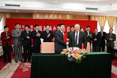 副院长施尔畏,中纪委驻中科院纪检组组长王庭大,中科院副秘书长邓麦村,山东省委书记、省人大常委会主任姜异康,山东省委秘书长王敏,山东省副省长李兆前等领导出席了签字仪式。施尔畏副院长主持了签字仪式。 姜异康在会谈中对中科院长期以来为山东省经济社会发展给予的支持表示衷心感谢。他指出,山东省不光是工农业大省、海洋大省,还是人口大省。山东在加速发展、迎接下一个发展周期的准备过程中,必须转型蓄势,提高科技含量,加快科技进步和自主创新。希望通过签署新一轮的全面战略合作协议,使中科院在山东的科研机构得到更好的加强,其作用得到更加充分的发挥。山东省将为中科院科研机构的工作开展提供全方位的服务和保障,使山东能够真正成为一个人才聚集、事业发展的平台,成为建设创新型社会、创新型省份的一个重要平台。 路甬祥在讲话中指出,中科院与山东省的合作经验证明,科技与科技转化需要两个动力,一是科技创新的动力,二是经济社会发展需求的动力。双方的成功合作对于共同应对金融危机,支持科学发展,建设创新型国家,走更加可持续发展的经济增长道路具有深远意义。在接下来的合作中,双方将以农业、海洋与海岸带、先进材料与先进制造、生物产业、信息产业、生态环境保护等领域作为合作重点,进一步解放思想,创新体制机制,共同探索一条提升自主创新能力,建设有中国特色的创新体系,建设社会主义创新型国家的道路。 山东省委、省政府有关部门,中科院办公厅、院士工作局、资环局、高技术局、院地合作局、规划战略局、人教局、农业项目办公室、及沈阳分院、海洋研究所、青岛生物能源与过程研究所、烟台海岸带可持续发展研究所等单位领导出席了签约仪式。