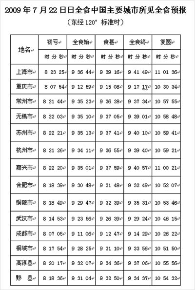 天文口有关天文台站将联合当地政府,以“2009国际天文年日全食科学观测和科普活动周”的形式,举办多点互动的科普活动,藉此大力普及科学知识,推动全民科学素质的提高。新闻发布会上,中国天文学会和国家天文台联合向铜陵、桐城、黟县、嘉兴、苏州、高淳、常州、无锡等八个城市颁发了“2009年日全食指定观测点”的牌匾和证书。这些处于全食带中心线的城市已经结合当地文化特点,策划和组织了一系列日全食观测和科普活动。 观测日全食时,应尽可能选择晴天的地区,并且要注意眼睛的安全。因为太阳光比月光强一百万倍,所以不能用肉眼或者通过没有减光设备的望远镜直接观看,否则容易造成视网膜损伤,甚至失明。日偏食期间,比较安全的方法是戴一副日全食观测镜,或者用装有墨水的水盆通过反射观看。用望远镜观测时一定要在目镜或探测器前加滤光片,以免灼伤眼睛。全食期间,可以用肉眼来直接观看,用望远镜拍摄之前,要去掉减光板或滤光片。