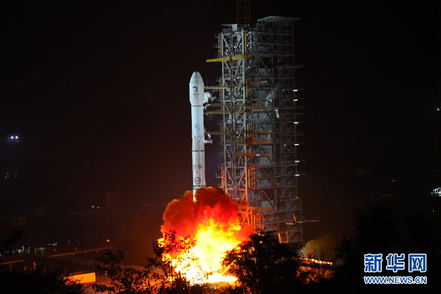 12月2日01时30分,搭载着我国嫦娥三号探测器的长征三号乙改进型运载火箭按照预定程序在西昌卫星发射中心二号塔架点火起飞。新华社记者 张宝印