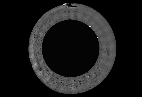 图7:2013年12月23日,全景相机拍摄的巡视器周边360°范围的全景镶嵌影像图,采用方位投影方式表达