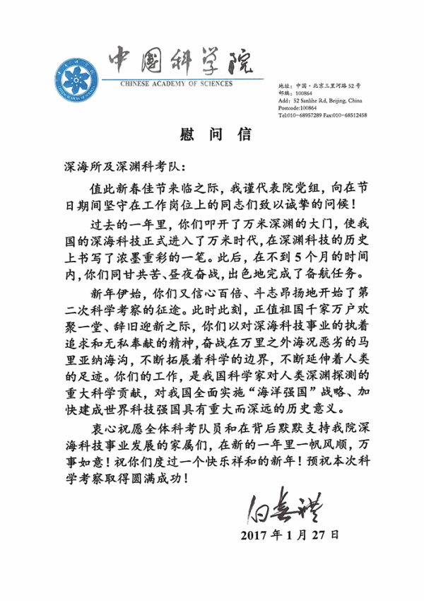 新年伊始,你们又信心百倍、斗志昂扬地开始了第二次科学考察的征途。此时此刻,正值祖国千家万户欢聚一堂、辞旧迎新之际,你们以对深海科技事业的执着追求和无私奉献的精神,奋战在万里之外海况恶劣的马里亚纳海沟,不断拓展着科学的边界,不断延伸着人类的足迹。你们的工作,是我国科学家对人类深渊探测的重大科学贡献,对我国全面实施“海洋强国”战略、加快建成世界科技强国具有重大而深远的历史意义。