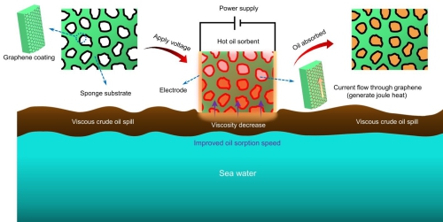 焦耳热辅助石墨烯修饰的海绵快速吸附高粘度浮油示意图