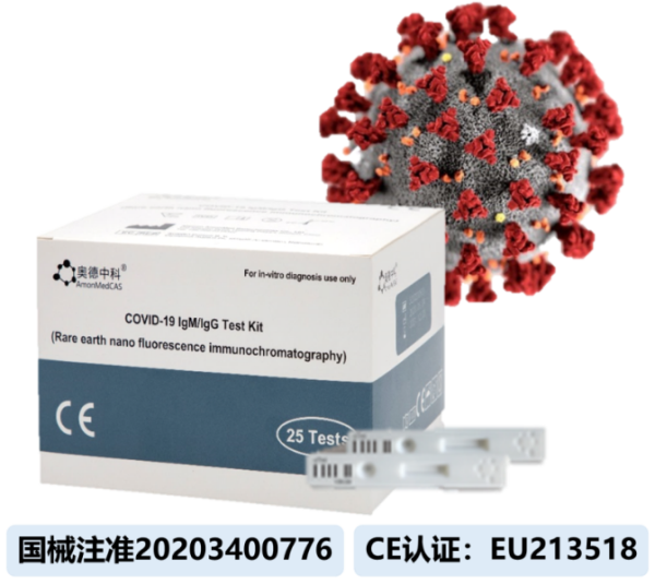 稀土纳米探针新型冠状病毒IgM/IgG抗体快速检测试剂盒及国家医疗器械注册证号、欧盟CE认证编号