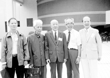 苏步青教授(中)创建的浙江大学微分几何学派中的五位温籍数学家,他们都是温州中学校友,左一白正国、左二方德植、右二杨忠道、右一为谷超豪。