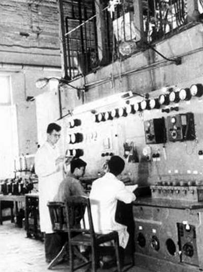 50年代初,张存浩(左一)在实验室进行水煤气合成液体燃料实验。