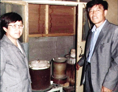 1987年赵忠贤(右)在自制的烧结YBCO的炉子边与黄玉珍的工作照