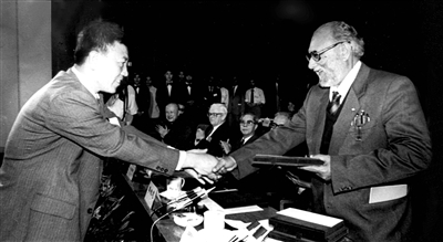 1987年9月,第三世界科学院Salam院长授予赵忠贤(左)TWAS奖
