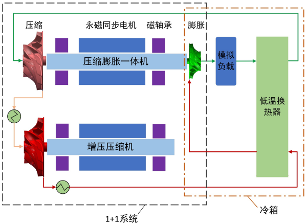 理化所研究员伍继浩、副研究员王金阵和博士研究生钞宝华组成研发团队,建造了一套“两机一平台”的测试系统。“两机”指的是两个动设备,包括一台压缩膨胀一体机和一台增压压缩机(简称“1+1系统”);“平台”是指为“两机”测试而配套的静设备,包括换热器、冷箱、负载、控制系统和管路系统等。这一测试系统的集成难度较高。系统中的冷箱是理化所低温工程与系统应用中心自2010年承担国家级专项项目以来规模最大的立式冷箱。