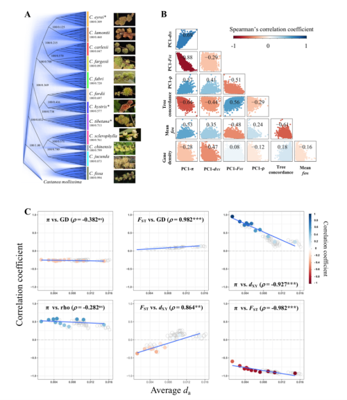 无码影片 华南植物园组装了高质量的甜槠参考基因组,进而对我国亚热带常绿阔叶林中广泛分布的12个锥属物种进行群体水平取样,通过基因组重测序获得了5千多万个单碱基核酸变异位点。群体基因组学分析发现,这些物种的基因组变异格局高度相似,遗传变异水平与重组率和基因密度相关,说明长期的连锁选择和保守的基因组特征共同塑造了相似的基因组变异景观。进一步,研究通过追踪多个遗传参数间相关性随着物种分化时间增加的变化趋势证实,除背景选择外,反复的选择性清除也是导致基因组相似变异模式的重要驱动力。该研究通过对不同物种基因组上等位基因分布模式、遗传负荷积累程度以及正选择信号的综合分析,揭示了种间渐渗特别是适应性渐渗对锥属物种基因组变异模式的影响。